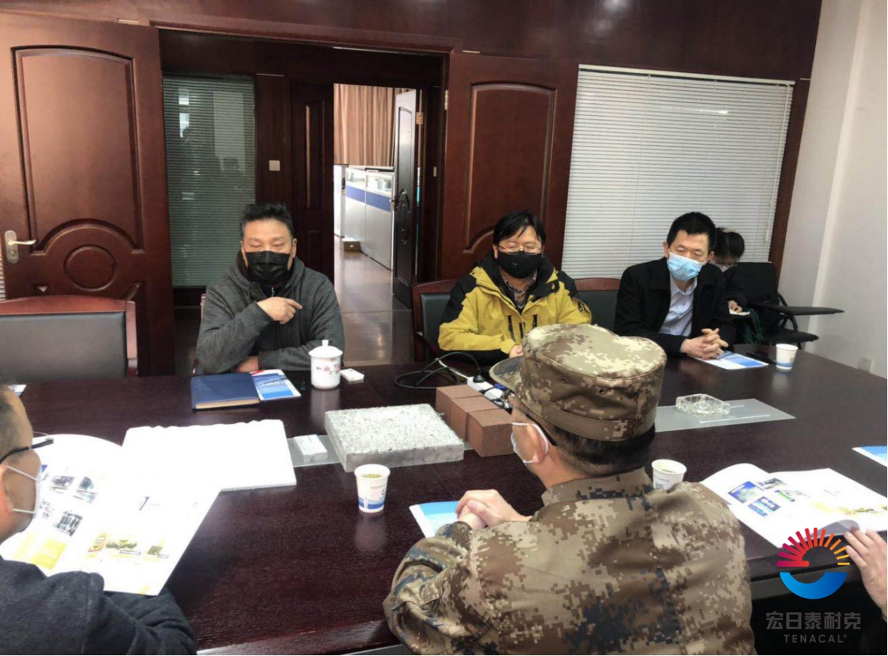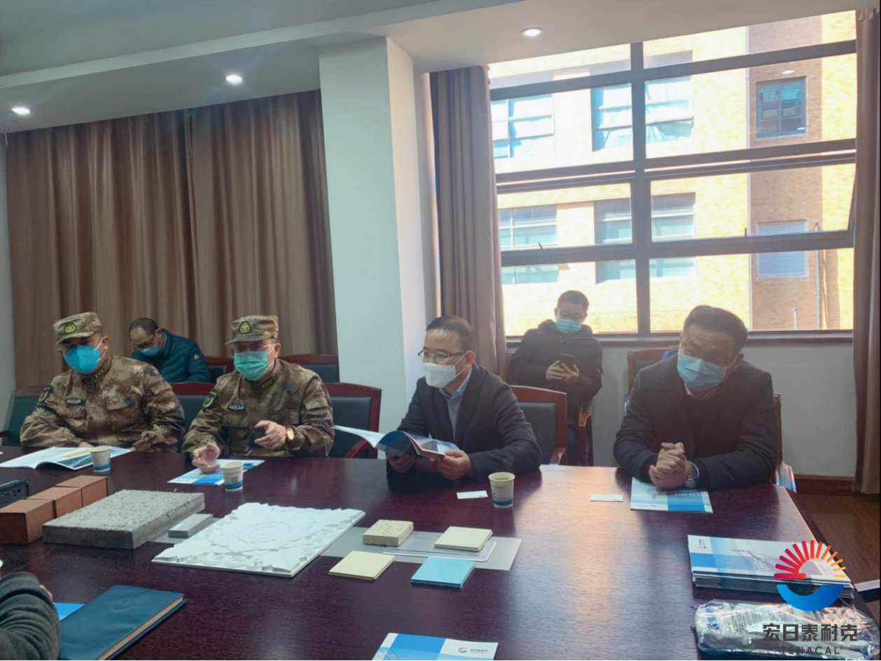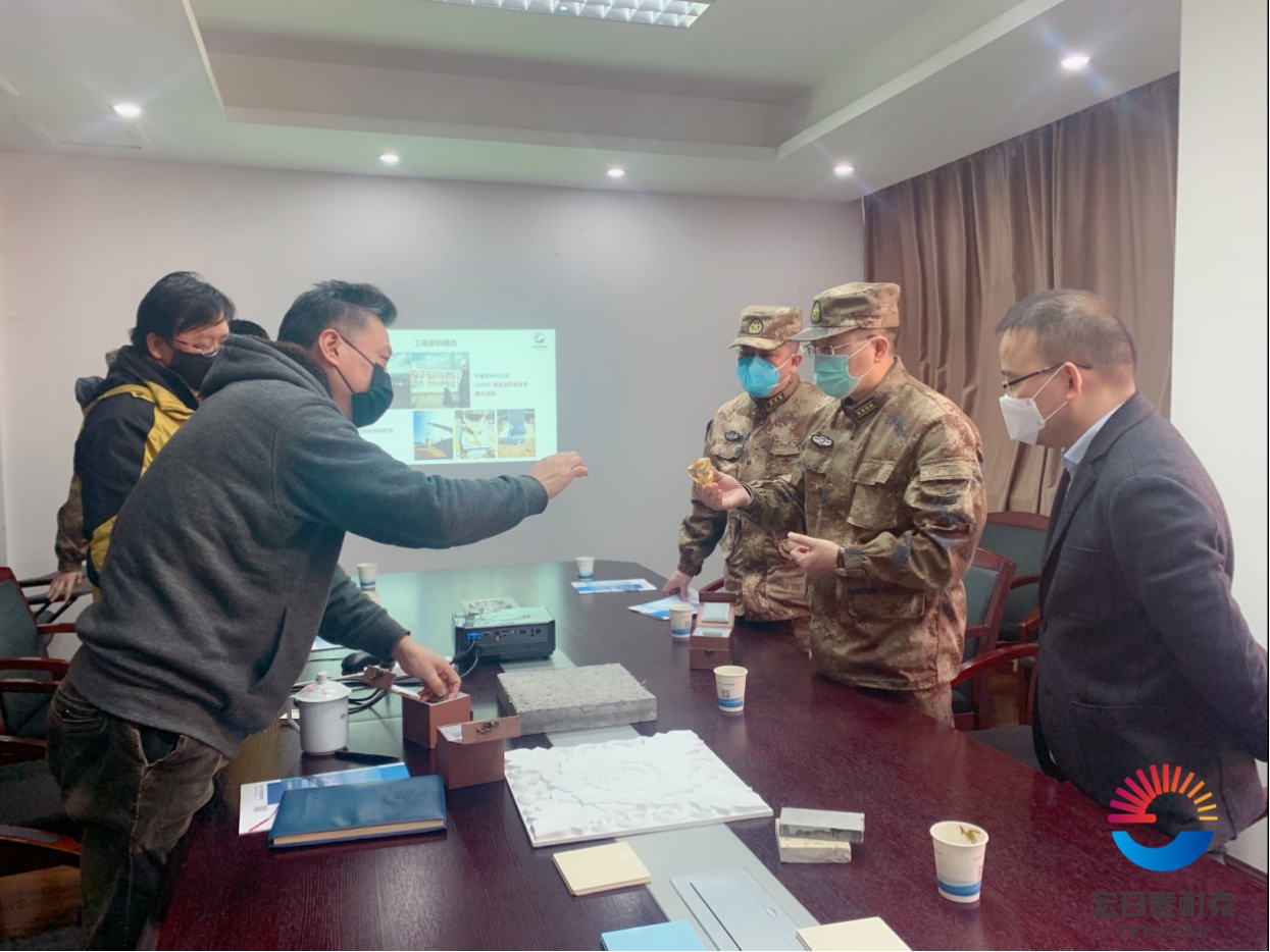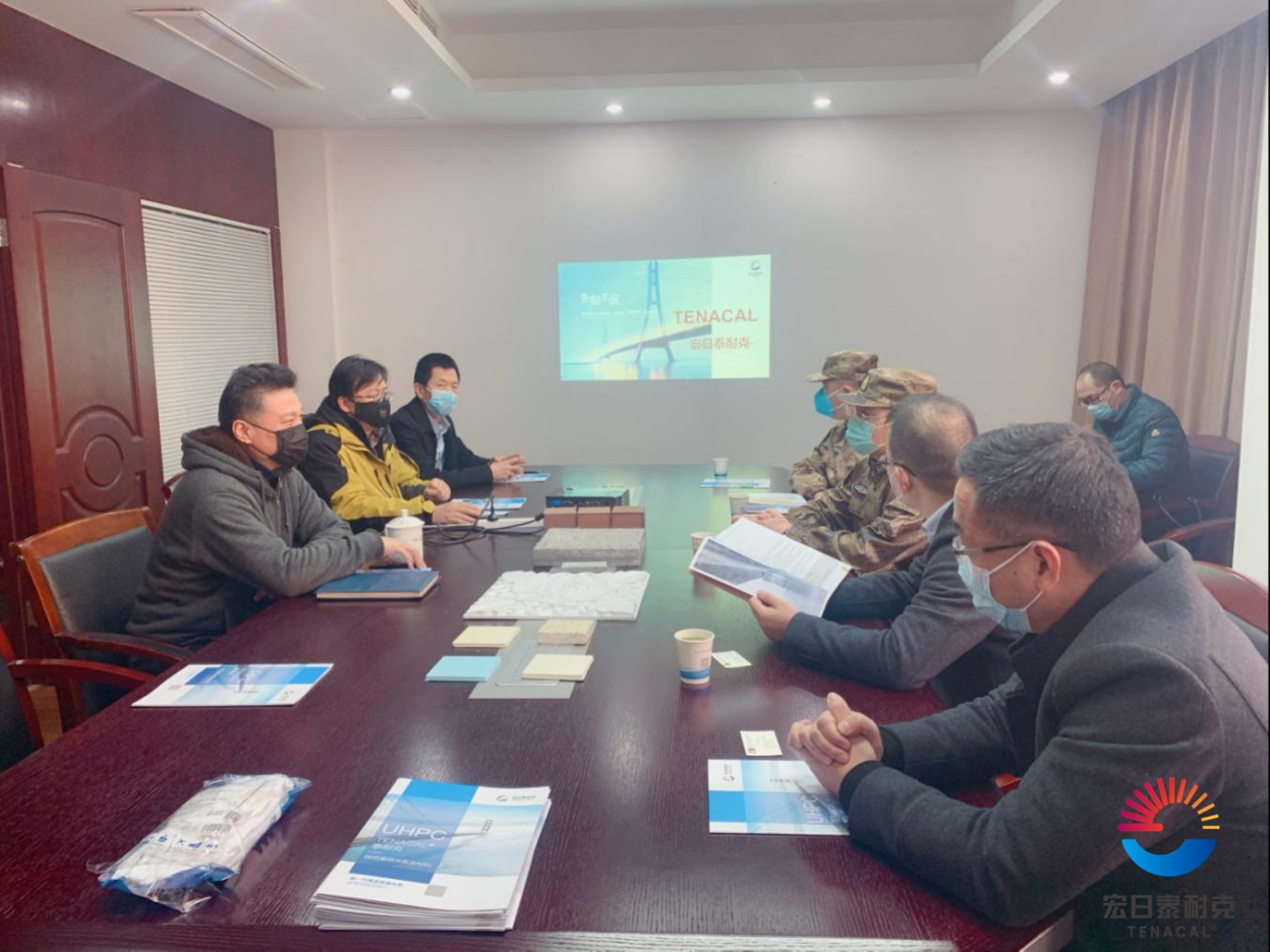 隨后,丁總向各位領(lǐng)導(dǎo)介紹了公司的基本情況、UHPC產(chǎn)品的特性和應(yīng)用領(lǐng)域以及公司重點(diǎn)工程案例。他通過(guò)實(shí)驗(yàn)視頻展示了UHPC產(chǎn)品在軍工防爆方面的優(yōu)異品質(zhì),得到了首長(zhǎng)的認(rèn)可和關(guān)注。沙司令員和何區(qū)長(zhǎng)都表示對(duì)UHPC的發(fā)展前景十分看好,并對(duì)中興大橋、機(jī)場(chǎng)路延伸段等項(xiàng)目情況進(jìn)行溝通了解。